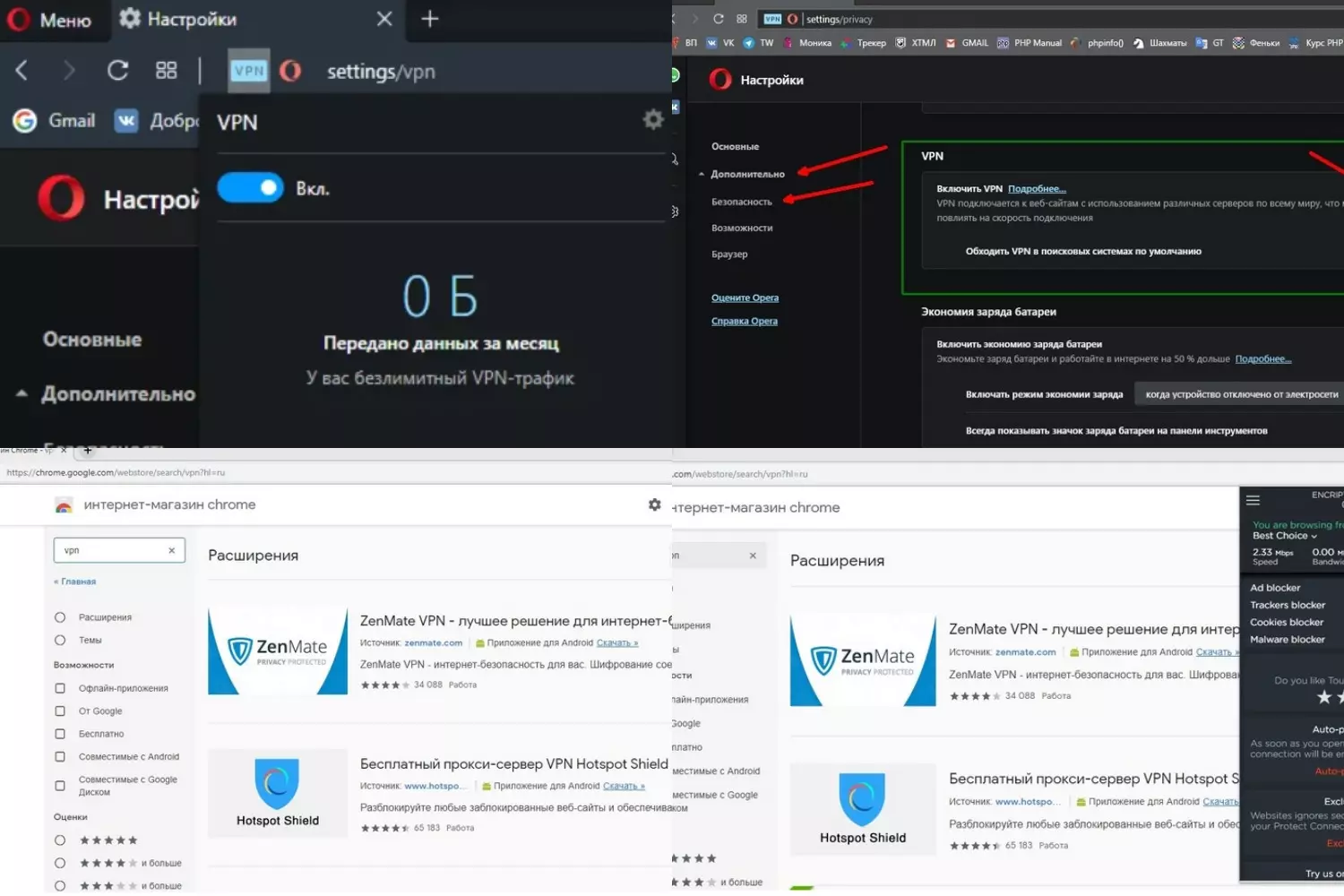 В других браузерах, вроде Google Chrome или Mozilla такой функции нет, но есть официальный интернет-магазин со встроенными ВПН-расширениями. Пользователю достаточно зайти в настройки браузера, перейти во вкладку с расширениями, выбрать подходящее и установить его.