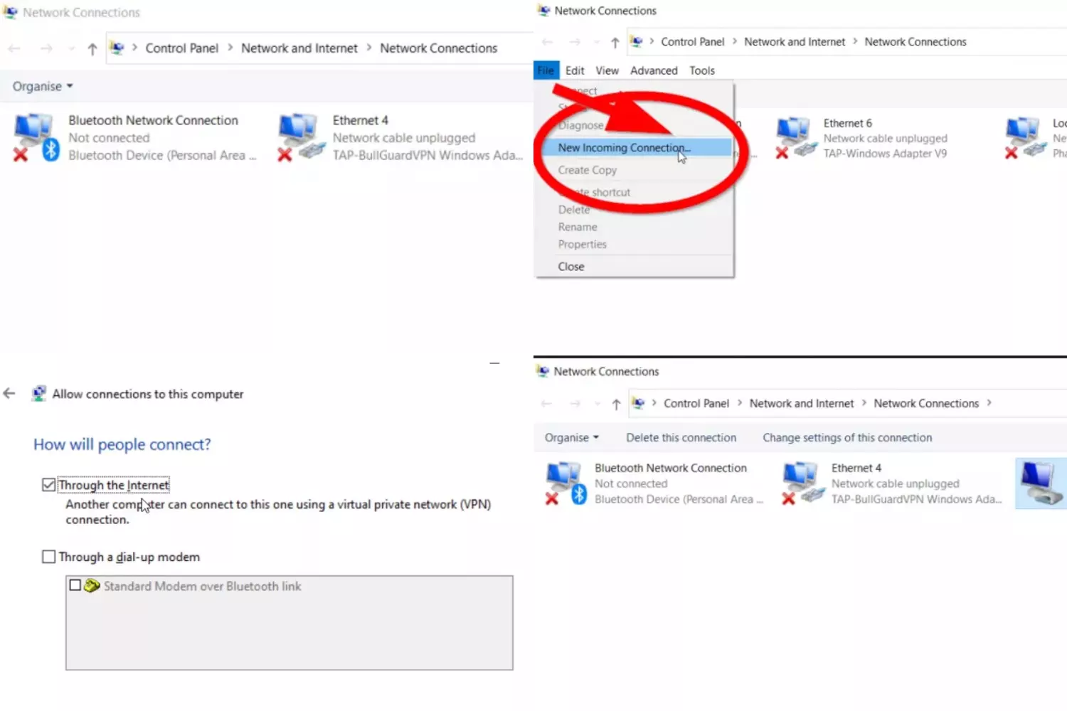 2. Далее необходимо нажать кнопку Alt для открытия меню «Сетевых подключений». Перед пользователем откроется полное меню. В нем нажимают на кнопку «Файл» и выбирают пункт «Новое входящее соединение».