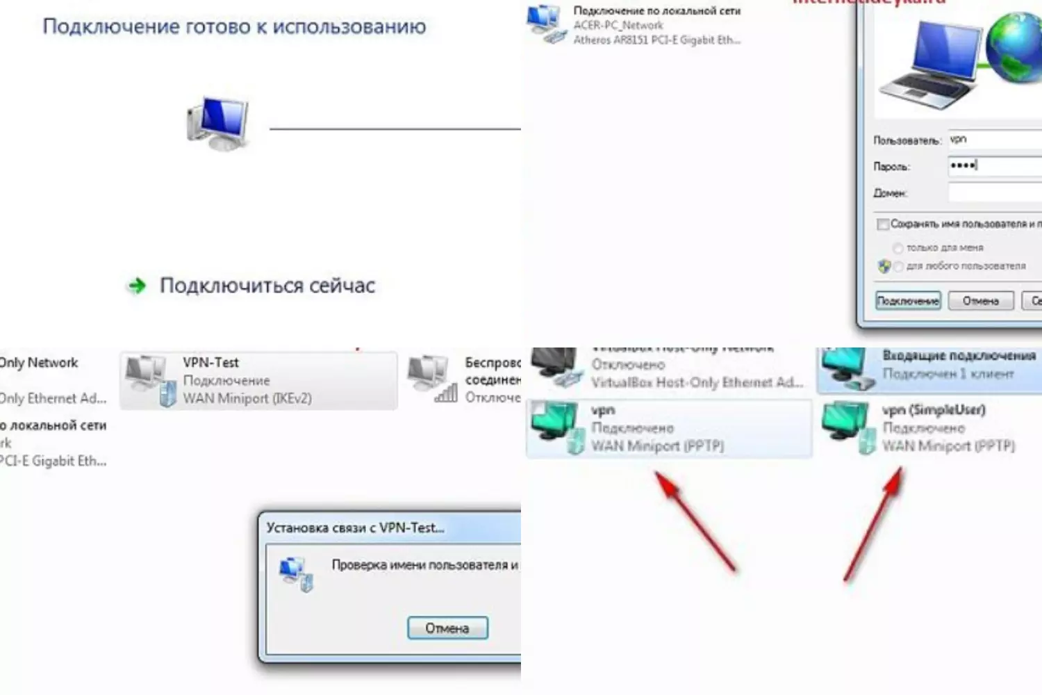Для каждого юзера необходимо создать имя и пароль, которые ему нужно будет вводить при подключении к Сети. Также перед пользователем во время настройки соединения откроется окно, в котором нужно поставить галочку напротив строки VPN. Это означает, что подключение к Интернету будет осуществляться поверх существующего соединения.