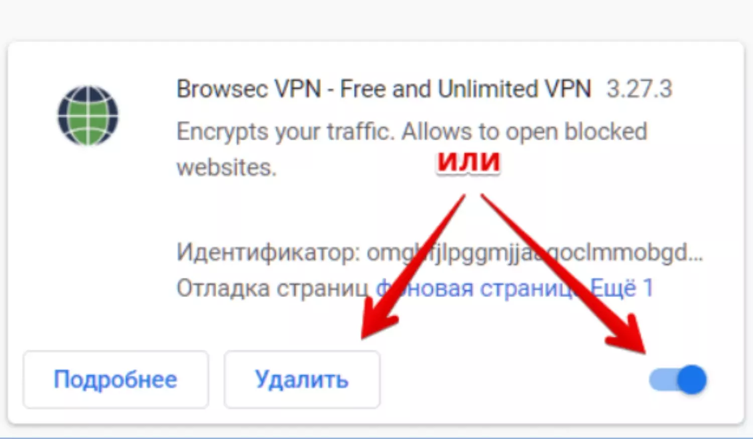 Если в данный момент использовать VPN не нужно, важно знать, как его отключать. Самый простой способ — стандартный. Пользователь переходит во вкладку установленных расширений, кликает по расширению и передвигает бегунок для отключения от зарубежного сервера.